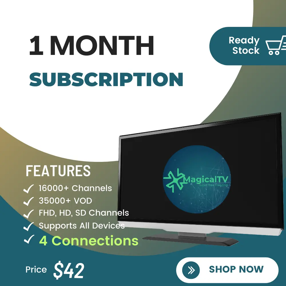 Magical IPTV 1 Month Subscription for 4 Devices is designed for families or groups who want to enjoy premium IPTV services on four devices simultaneously for 30 days.